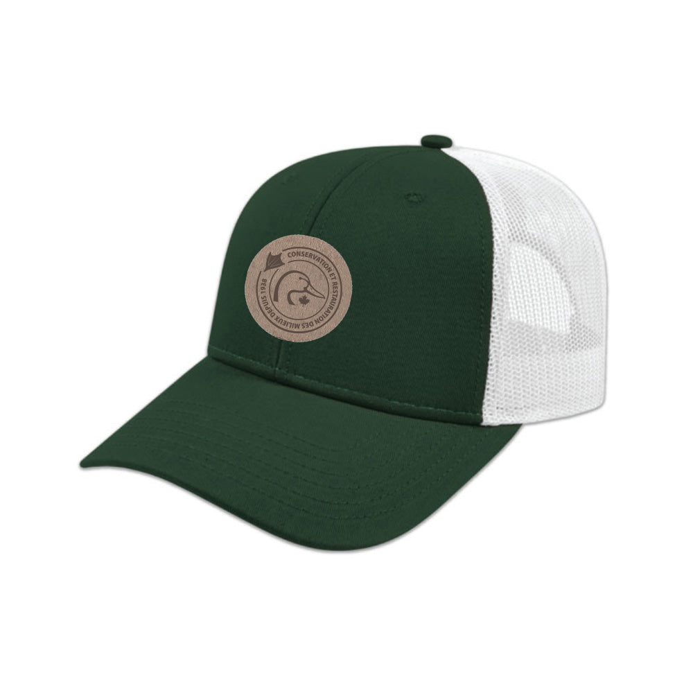 The Legacy Crest Cap blends rugged looks with understated conservation pride. Featuring a brown leather patch embossed with a DUC crest, this structured six-panel cap is built with a chino twill front, mesh back, and modified flat visor. Adjustable plastic snap tab closure ensures a perfect fit. One size fits most.